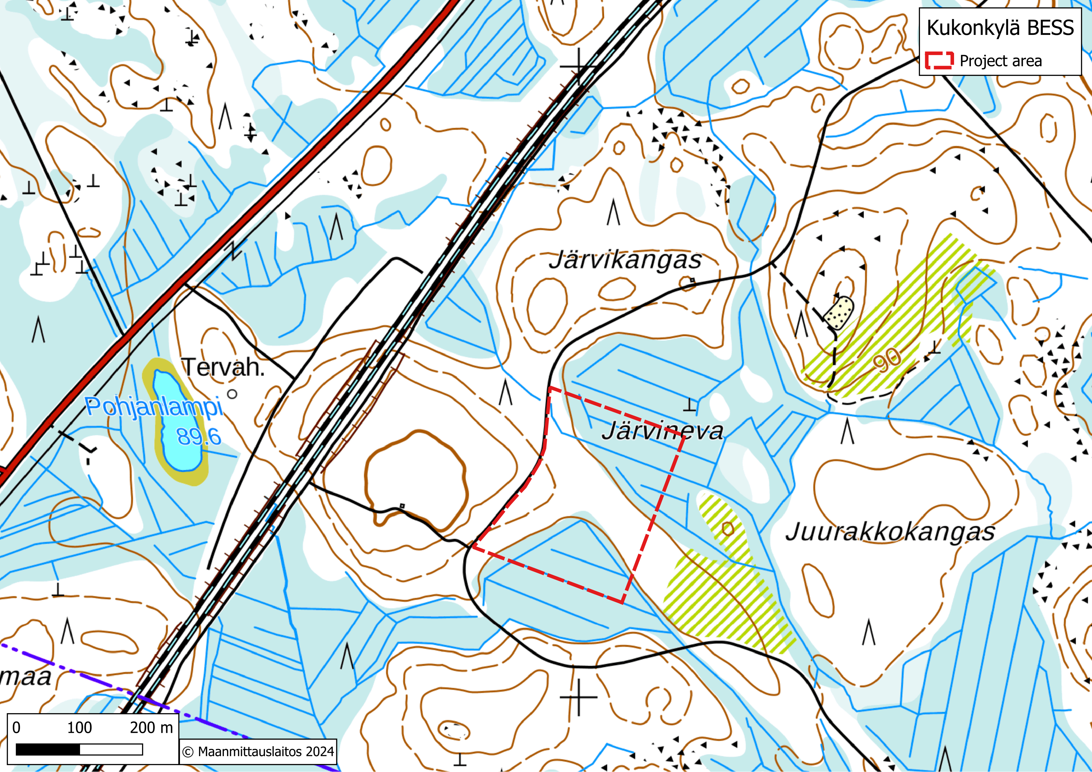 A building permit has been granted in spring 2025 for a battery energy storage system (BESS) to be located near the new substation under construction in Kukonkylä, Sievi, in the Järvineva area. The total power capacity of the system will be 125MW with an energy capacity of 250MWh. Detailed technical planning is progressing in accordance with the conditions set in the building permit.